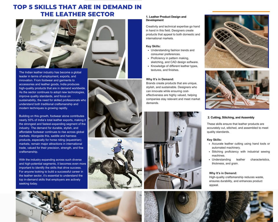 The Indian leather industry has become a global leader in terms of employment, exports, and innovation. From footwear and garments to accessories and leather goods, India produces high-quality products that are in demand worldwide. As the sector continues to adopt new technologies, improve quality standards, and focus on sustainability, the need for skilled professionals who understand both traditional craftsmanship and modern techniques is growing rapidly. Building on this growth, footwear alone contributes nearly 55% of India’s total leather exports, making it the strongest and fastest-expanding segment of the industry. The demand for durable, stylish, and affordable footwear continues to rise across global markets. Alongside this, saddle and harness products, especially for horse riding (equestrian) markets, remain major attractions in international trade, valued for their precision, strength, and fine craftsmanship. With the industry expanding across such diverse and high-potential segments, it becomes even more important to identify the skills that drive success. For anyone looking to build a successful career in the leather sector, it’s essential to understand the top in-demand skills that employers are actively seeking today.